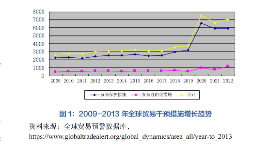 自布雷頓森林體系建立以來,經濟全球化和貿易自由化已成為優化資源配置、刺激全球供應鏈活力、增強全球經濟協調性的主要趨勢。然而,經濟全球化也是一把“雙刃劍”,在促進經濟貿易增長的同時,也帶來包括環境惡化、國家間貧富差距擴大等一系列挑戰,導致國際利益分配的不均衡,從而出現反對分配不公的逆全球化思潮。根據全球貿易預警數據庫的統計,2009-2022年,全球貿易干預措施顯著增加,總數由2009年的2678項增加至2013年的3110項。其中,已實施的貿易保護措施數量大大超過實施的貿易自由化措施數量,貿易保護措施由2009年的2228項增加到2013年的2530項,此后持續攀升至2020年峰值的6579項;貿易自由化措施雖然也在增加,但僅由2009年的450項增加到2013年的580項,在2022年達到峰值,為1116項,如圖1所示。與此同時,在國際金融危機及不斷增加的貿易壁壘影響下,全球貨物貿易發展受到明顯沖擊,2009-2013年全球貨物貿易進出口額總體呈現下降趨勢。2009年全球貨物貿易進出口增長率為-22.25%。雖然2009年后全國貨物貿易進出口額有所回升,但增速相對緩慢。