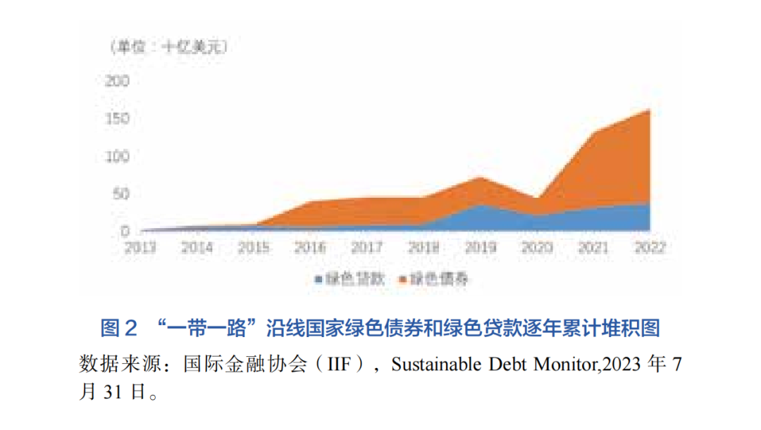 2013-2022年來,“一帶一路”沿線國家的綠色債券和綠色貸款發(fā)行量逐年遞增,呈現(xiàn)井噴式增長。綠色債券和綠色貸款發(fā)行總額從2013年的不足30億美元增長到了2022年的1645億美元,除了2020年受疫情原因有所下降,其余各年均保持高速增長態(tài)勢(shì),2021和2022年年均增長率更達(dá)到194%和24%。