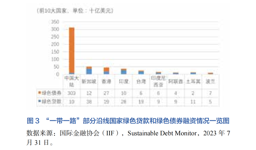 總體來看,近些年來,許多“一帶一路”國家從主要依靠財(cái)政資金轉(zhuǎn)向開發(fā)性貸款、項(xiàng)目融資、綠色資本市場(chǎng)債權(quán)股權(quán)融資等各類混合融資。根據(jù)彭博社數(shù)據(jù)庫統(tǒng)計(jì),2010至2022年,“一帶一路”沿線國家和地區(qū)累計(jì)共發(fā)行綠債4000億美元,占全部綠債發(fā)行的20%。沿線國家和地區(qū)同期綠色貸款累計(jì)超過1930億美元10,占全部綠色貸款累計(jì)額的27%。中國、中國香港特別行政區(qū)、新加坡和印度分別位居“一帶一路”沿線國家和地區(qū)綠色債券發(fā)行量前四位,綠色貸款總額也位居世界前列。中國臺(tái)灣省、土耳其、阿聯(lián)酋、印度尼西亞及沙特阿拉伯在綠色貸款方面也有突出的表現(xiàn)。此外,亞洲實(shí)力雄厚的主權(quán)財(cái)富基金(如中投公司、新加坡淡馬錫、阿聯(lián)酋穆巴達(dá)投資公司)以及多元化的中長期投資基金(如絲路基金和中國-中東歐基金)成為“一帶一路”沿線綠色股權(quán)投資的重要參與方。