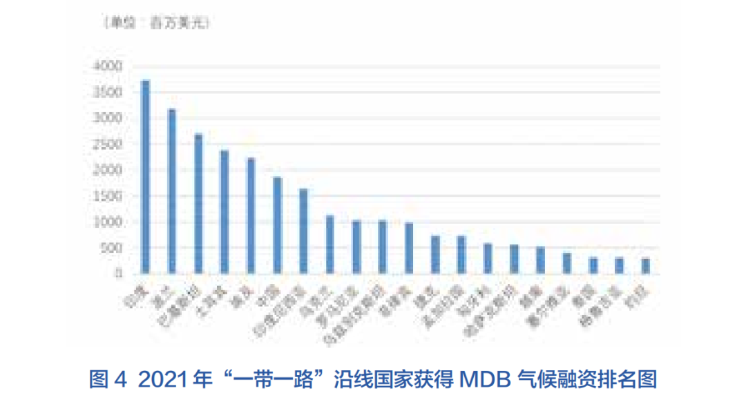 《2021年多邊開發(fā)銀行氣候融資聯(lián)合報(bào)告》披露,2021年MDB氣候融資總量達(dá)818億美元,其中625億美元用于支持氣候減緩類項(xiàng)目活動(dòng),192億美元用于支持氣候適應(yīng)性項(xiàng)目活動(dòng)。MDB還調(diào)動(dòng)了共計(jì)897億美元配套資金,其中45.7%來自私營部門。2021年,“一帶一路”沿線國家共接受MDB約300億美元的氣候融資,其中印度(37.4億美元)、波蘭(31.9億美元)、巴基斯坦(27.0億美元)、土耳其(23.9億美元)和埃及(22.3億美元)獲得的氣候融資額最大